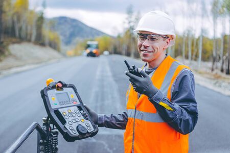 Workers on a road construction site. Asphalting, laying of asphalt on the road.