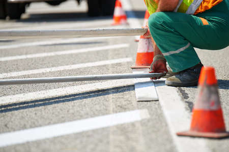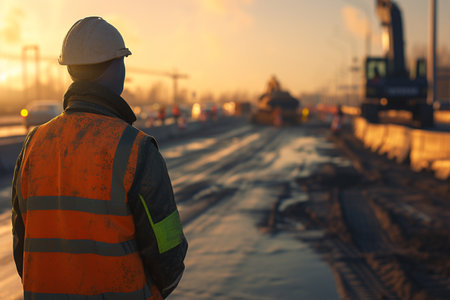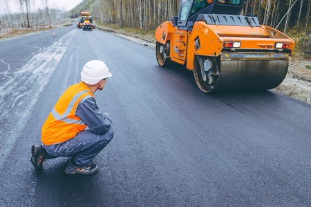 Asphalt road construction site with workers and machinery on the background at sunset.