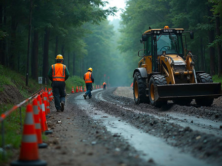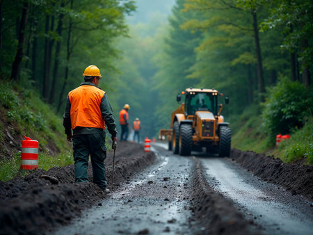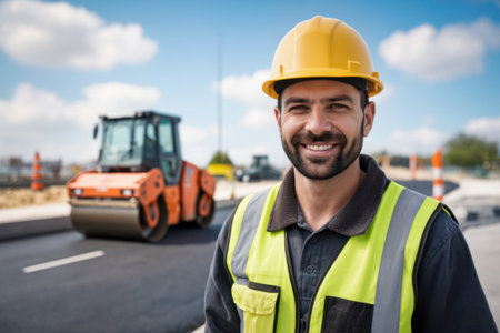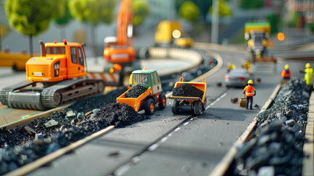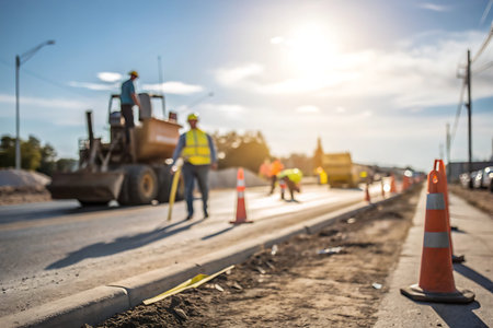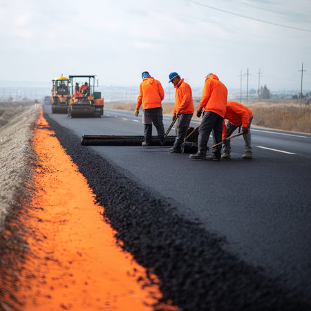 Workers operate heavy machinery on a bright day, laying fresh asphalt on a busy road with construction tools and vibrant activity highlighting progress.