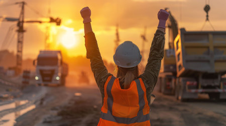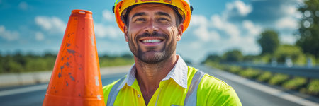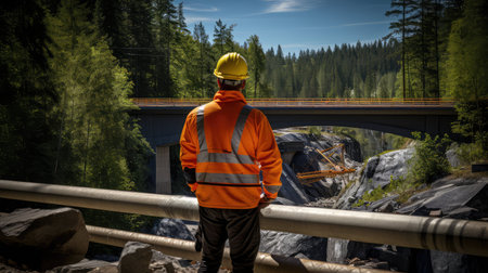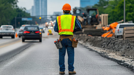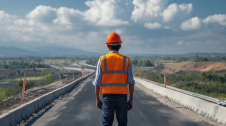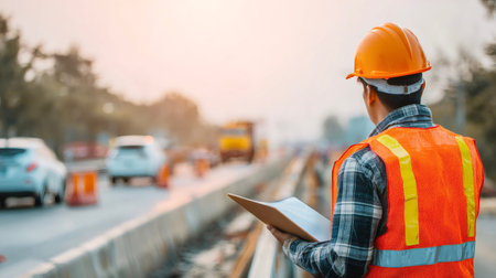 Engineer wearing an orange hard hat and safety vest, holding a clipboard and pen, overseeing infrastructure development and assessing progress on a busy city roadwork area