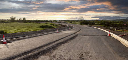 Construction of a new modern highway Tavrida in the Crimea. Fresh black asphalt is separated by yellow and red road barriers. Sunny summer day