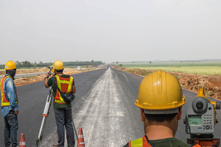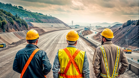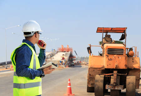 Highway engineers discuss plans for construction improvement based on roadworks. Soil Fill, Backfill Compaction for Sub base, Base Course, Surveyor Engineer inspector in highway construction.