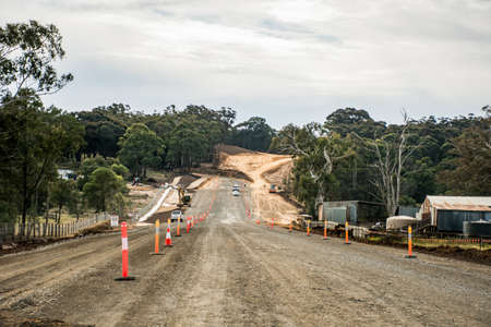 Roadworks on a highway with gravel road in Australia. Road construction works on Nerriga Road, NSW