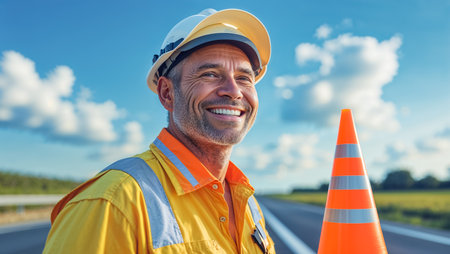 A construction worker observes the long, empty road ahead while dressed in safety gear on a cloudy afternoon.