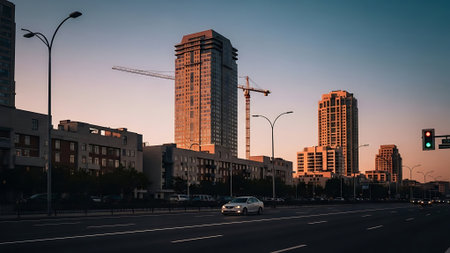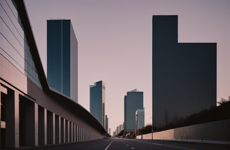 The image captures a city street lined with skyscrapers, showcasing an orange and red sunset. The composition features a road with yellow lines, creating a sense of perspective. This urban scene displays architectural details and warm colors. Suitable for commercial applications, the image may illustrate various themes.