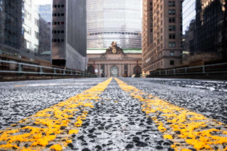NEW YORK CITY - APRIL 19, 2020: View of empty street at Grand Central Terminal in Manhattan during the Covid-19 Coronavirus pandemic lockdown.
