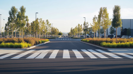 A zebra crossing in a quiet industrial park, bordered by neat rows of shrubs.
