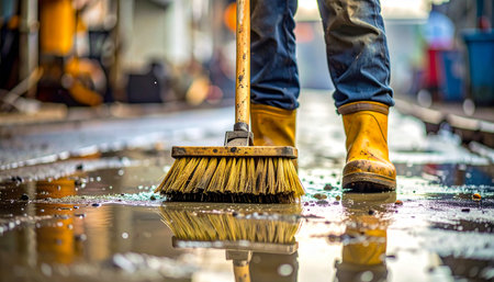 A person wearing blue jeans and yellow rubber boots sweeps a wet, reflective outdoor surface with a yellow-bristled broom, showing puddles and...