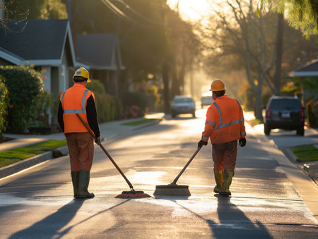 Two workers in orange vests and hard hats sweep a residential street at sunrise, casting long shadows