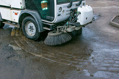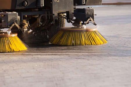 Close-up sweeper machine cleaning. Concept clean streets from debris. Selective focus.