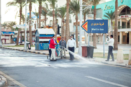 Egypt, Hurghada, 22 March 2020, workers doing desinfection of street to protection of coronavirus