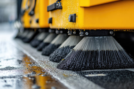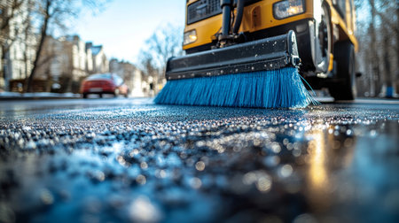 A close-up view of a street sweeping machine as it meticulously cleans a wet asphalt road. The image captures the intricate details of the brush in action.