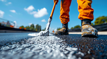 Close-up of a worker applying white paint on asphalt road under clear skies.