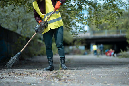 pretty volunteer female cleaning up park from dust waste and foliage