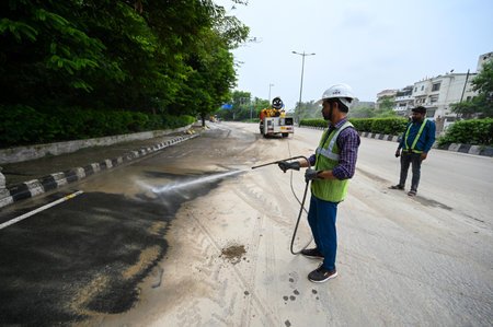 NEW DELHI, INDIA - JULY 15: PWD along with MCD workers seen trying to clean the silt remained on Ring road from Yamuna River at Chandgiram Akhara on July 15, 2023 in New Delhi, India. The water level of the river has been rising since Wednesday after it b
