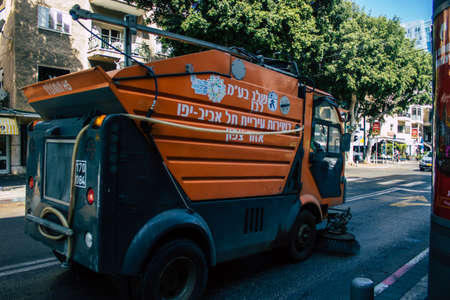 Tel Aviv Israel September 29, 2020 Closeup of an orange garbage truck rolling in the empty streets of Tel Aviv during the lockdown and the Coronavirus outbreak