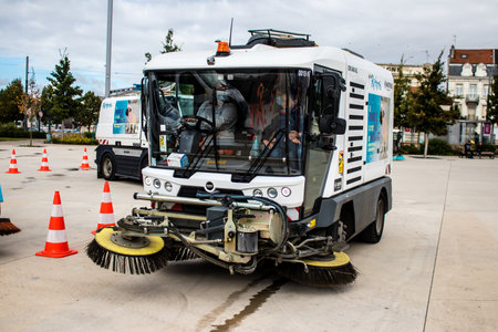 Reims, France - September 17, 2022 Street cleaning cars and garbage truck parked in the streets of Reims taking part in the world day to clean up our planet, garbage collection helps prevent pollution