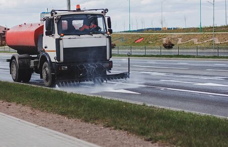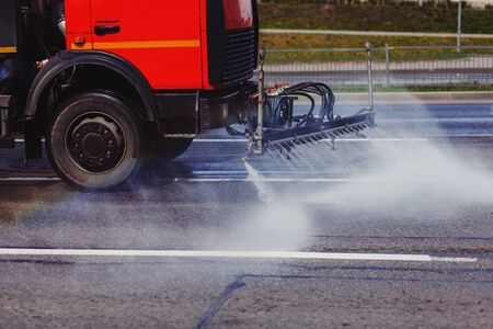 Cleaning machine washes asphalt road surface the city street,