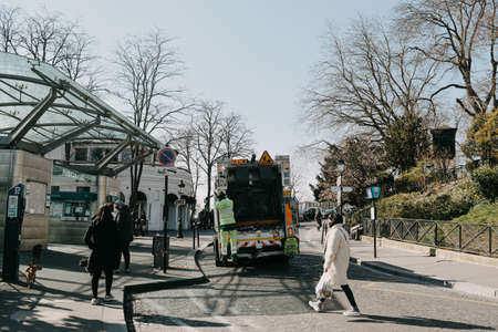 PARIS, FRANCE, 08/03/2022 Scavengers work near the Basilica of the Sacré-Coeur. The cleanliness of the city of Paris.