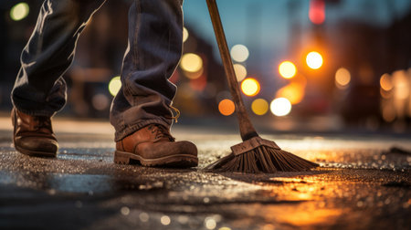 A street maintenance worker gears up with a machine, clearing debris from a city pavement bathed in warm sunset hues, capturing urban renewal.