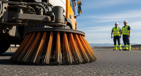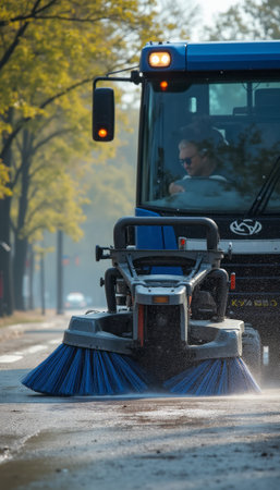 Demonstration of street cleaning machine with brushes in action on a road. Concept Street Cleaning Machine, Road Maintenance, Urban Sanitation, Equipment Demo, Brush Technology