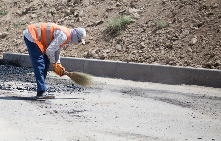 City worker doing cleaning on the roadside asphalt. He has a broom and a shovel in his hand.