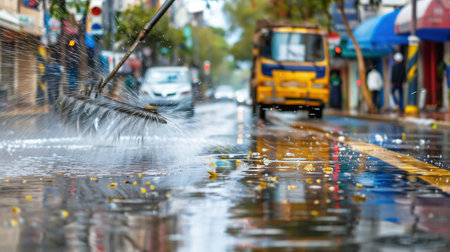 A dynamic urban cleaning scene shows water spraying over a wet street, highlighting reflections and the vibrant atmosphere of city maintenance work.