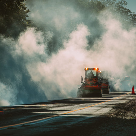 A construction scene showcasing machinery conducting road maintenance with sweeping equipment on a wet asphalt surface illuminated by sunlight.