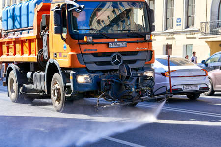Saint Petersburg, Russia - June 10, 2021: Wet street cleaning using special equipment in Peterbuog