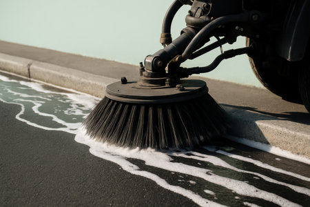 Industrial street cleaning machine scrubbing urban roadside pavement with rotating brush and soapy water in city sanitation process.