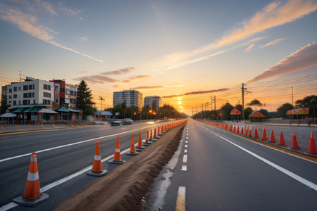 Urban scene featuring vibrant traffic cones lining a city street during sunset, creating a warm and inviting atmosphere while promoting road safety.