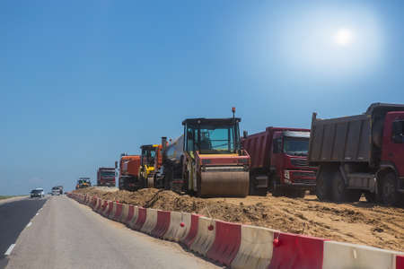The backfilling and compaction of the vibratory roller during the construction of the Expressway Tavrida in the Crimea