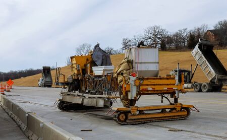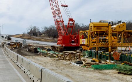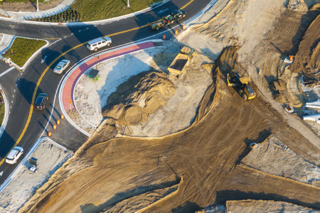 Industrial roadworks. Roundabout on wide American highway under construction. Development of transportation system for rapid transit