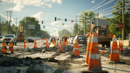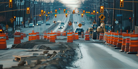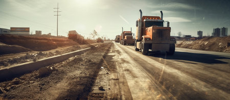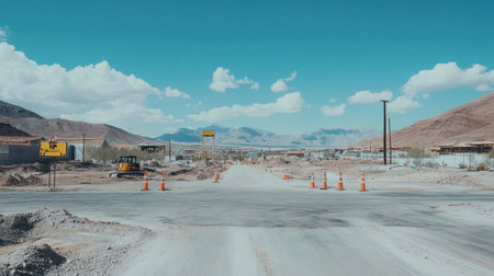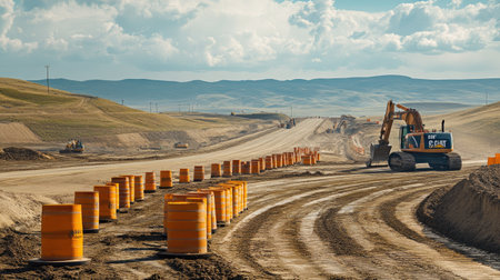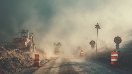 Industrial road under construction, construction signs, machinery, dusty air, gritty atmosphere