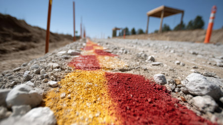 A close-up view of colorful road markings in red and yellow on a gravel pathway at a construction site under a bright blue sky, showcasing progress.