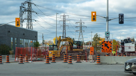 Ottawa ON, Canada - October 25, 2025: Busy construction site features heavy machinery, traffic signals, and safety barriers, illustrating urban infrastructure development with copy space