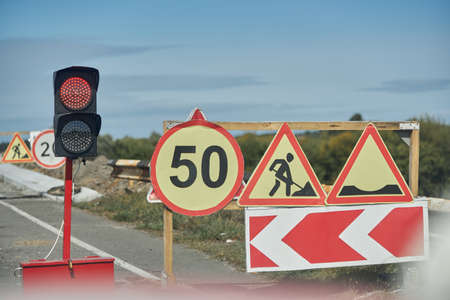 The traffic light is red, stop, repairs on the asphalt road, road signs.