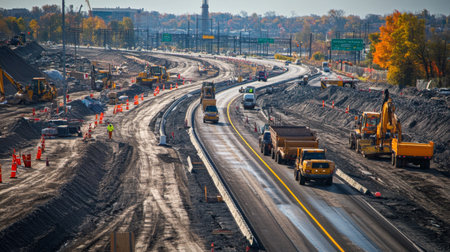 An expressway under construction, featuring machinery, construction barriers, and workers, showing the development and maintenance of major roadways.