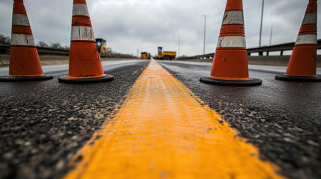 A detailed view of a road construction site showcasing orange traffic cones and a fresh yellow line on the asphalt, with construction vehicles ready for work.