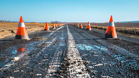 Empty Modern Road Under Construction with Traffic Cones in a Rural Setting. Concept of Infrastructure Development, Road Safety, Engineering, Progress.