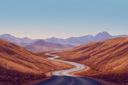 A winding road winds through the desert, with mountains in the background. The road is made of asphalt and curves to create an adventurous feel. In the distance, another mountain range is visible on the horizon. Scattered rocks add depth to the scene. Captured by a professional photographer using a high-resolution camera and wide-angle lens. --ar 3:2 --v 6.1 Job ID: 7dca25db-2fe2-4f0c-9d4f-2282ff46fa2e