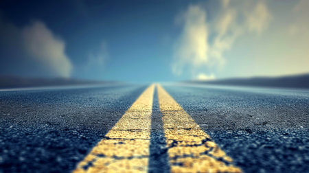 This captivating close-up image showcases a yellow painted line on a road, emphasizing the texture of the asphalt and surrounding outdoor scenery, perfect for travel themes.