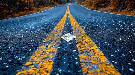 A striking autumn scene featuring a road adorned with fallen leaves and a bright yellow line. This captivating image evokes a sense of tranquility and adventure in nature.