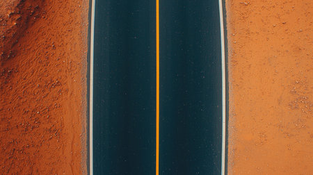 Close-up of a yellow asphalt road with black pavement and red rocks in the background on a sunny day, a road trip concept. The blue sky, bokeh effect, and depth of field create a boho-style, symmetrical composition in a flat lay shot with a blurred background and low-angle view of the desert landscape. The close-up of the yellow line on the highway is set in the Nevada mountains. --chaos 30 --ar 16:9 --v 6.1 Job ID: e93427f1-a04e-4c98-b2e2-deb25e687d05