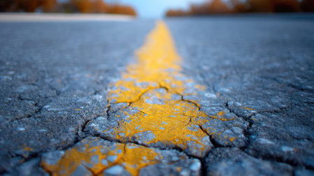 A close-up shot showcasing a cracked asphalt road with a faded yellow line. The image captures the beauty of nature during autumn, featuring warm tones and an empty, tranquil scene perfect for themes of travel and exploration.