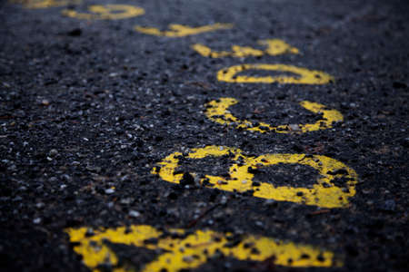 This close-up image features a vibrant yellow number twenty painted on an asphalt road, showcasing detailed texture and a clear perspective on urban signage.