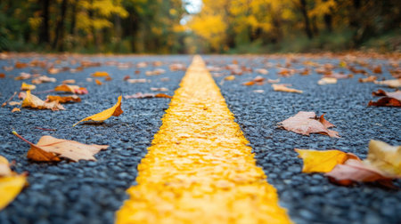 A striking autumn scene featuring a road adorned with fallen leaves and a bright yellow line. This captivating image evokes a sense of tranquility and adventure in nature.