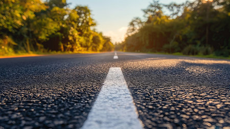 This captivating close-up image showcases a yellow painted line on a road, emphasizing the texture of the asphalt and surrounding outdoor scenery, perfect for travel themes.