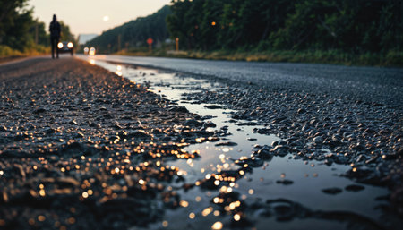 A high angle shot of water on the side of the road