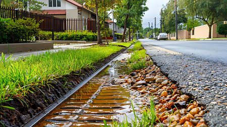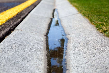 gutter of a stormwater drainage system on the side of an road with yellow and white markings and green lawn on wet weather after rain, close up view, nobody.